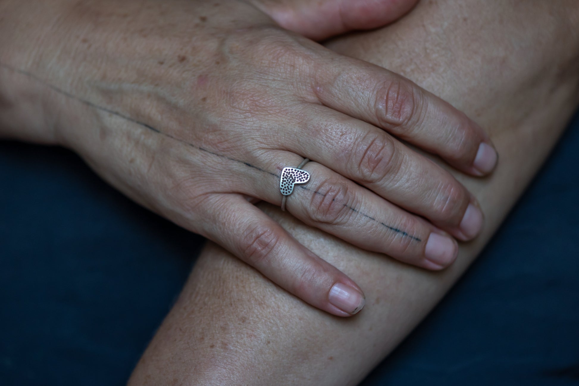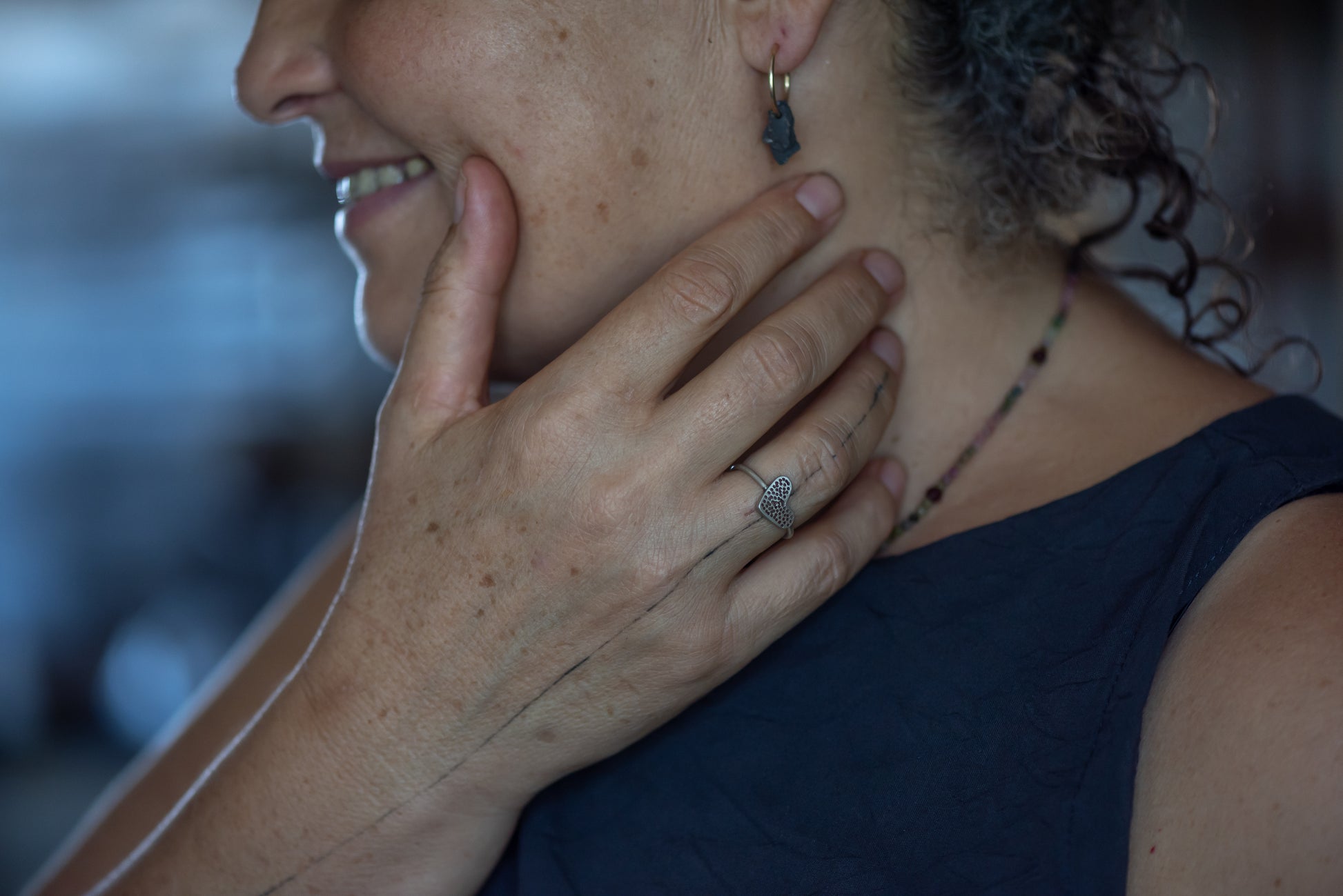 טבעת עם צורת לב מנוקבת בעשרות חורים שנוצרו בקפידה בעבודת יד. משחק בין מלא לריק, בין חוזק לשבריריות