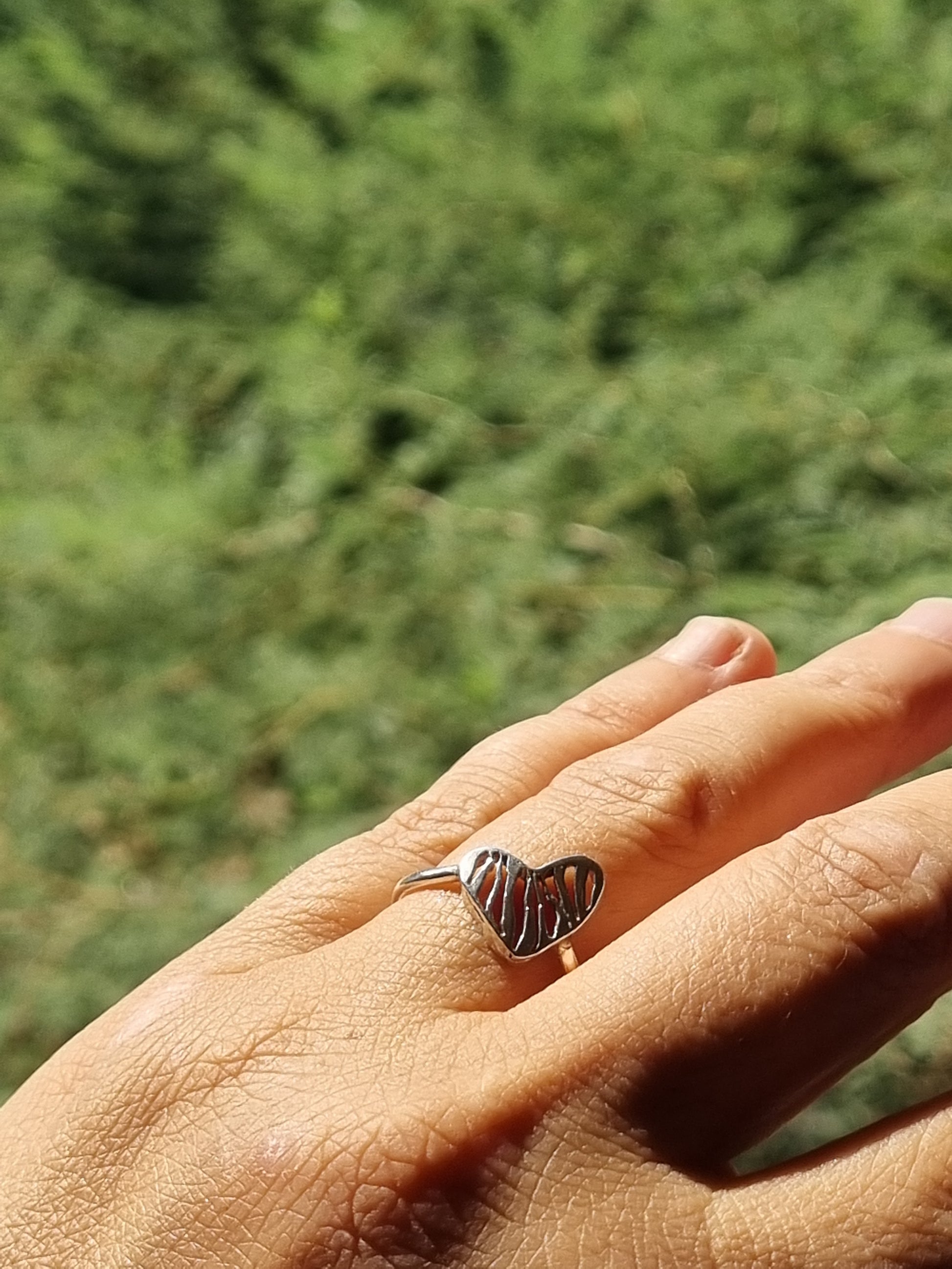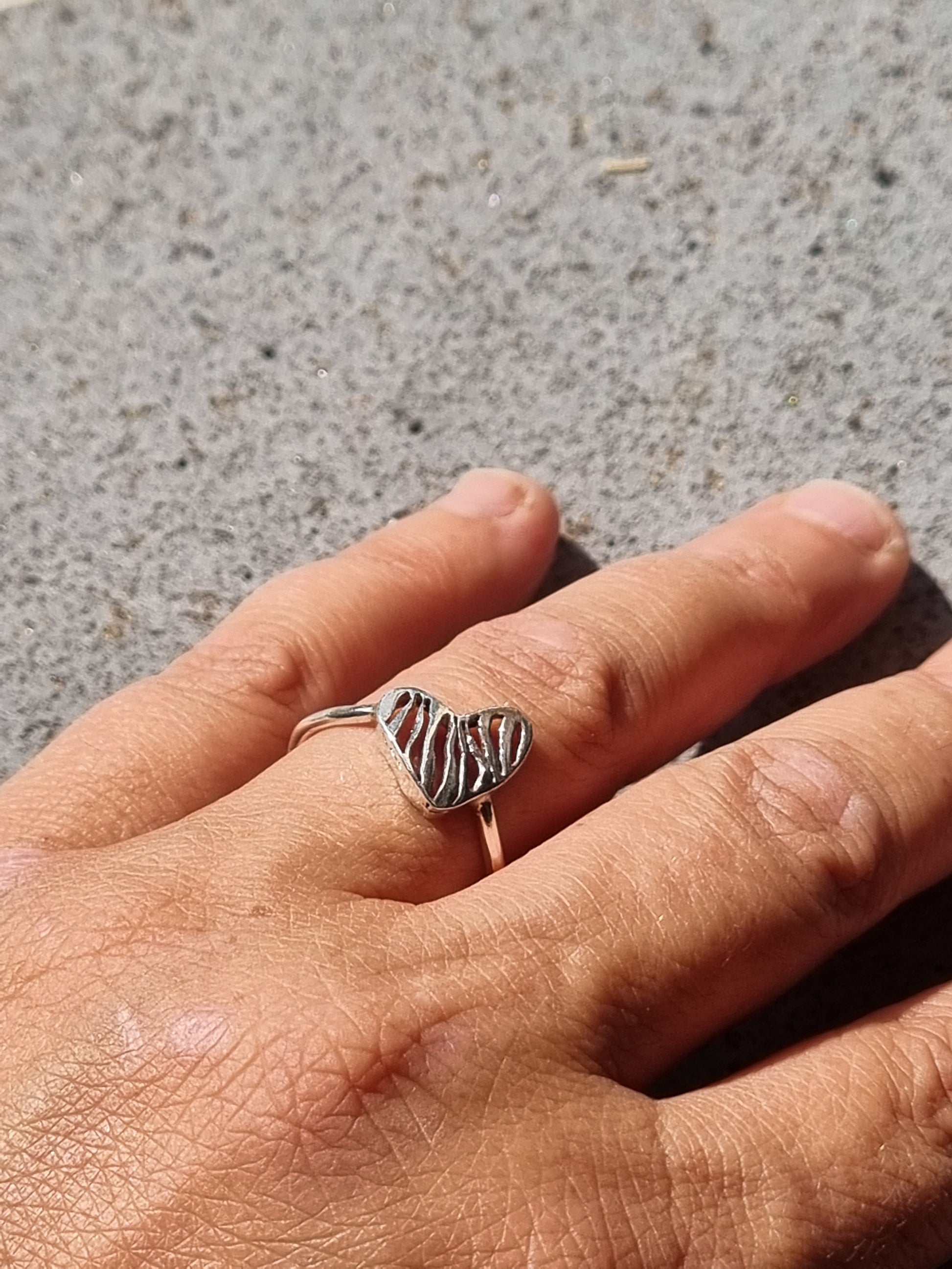 טבעת עם לב שבתוכו מנוסרים קוים עדינים בעבודת יד