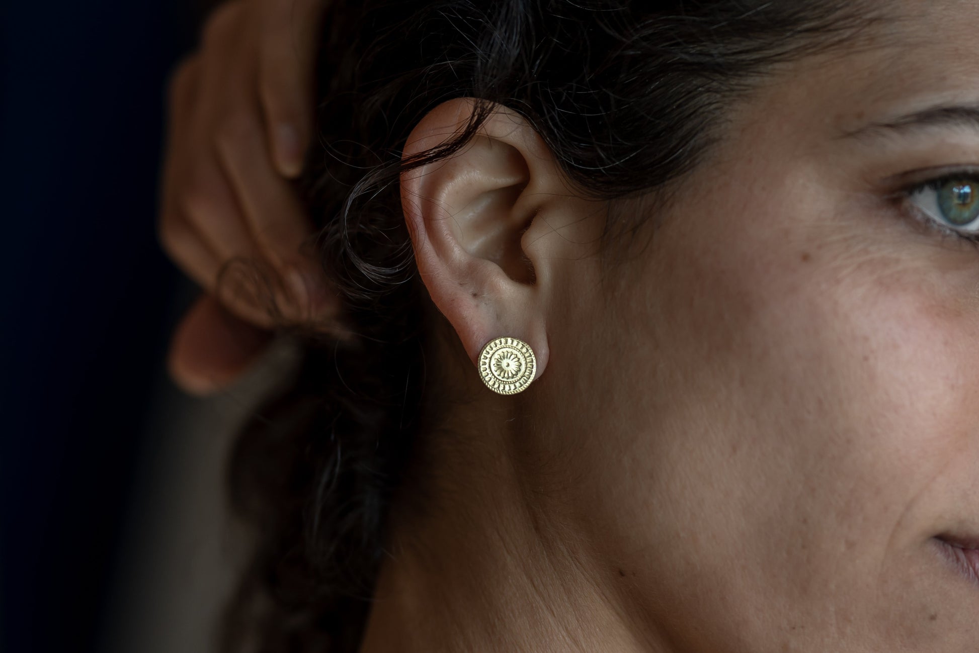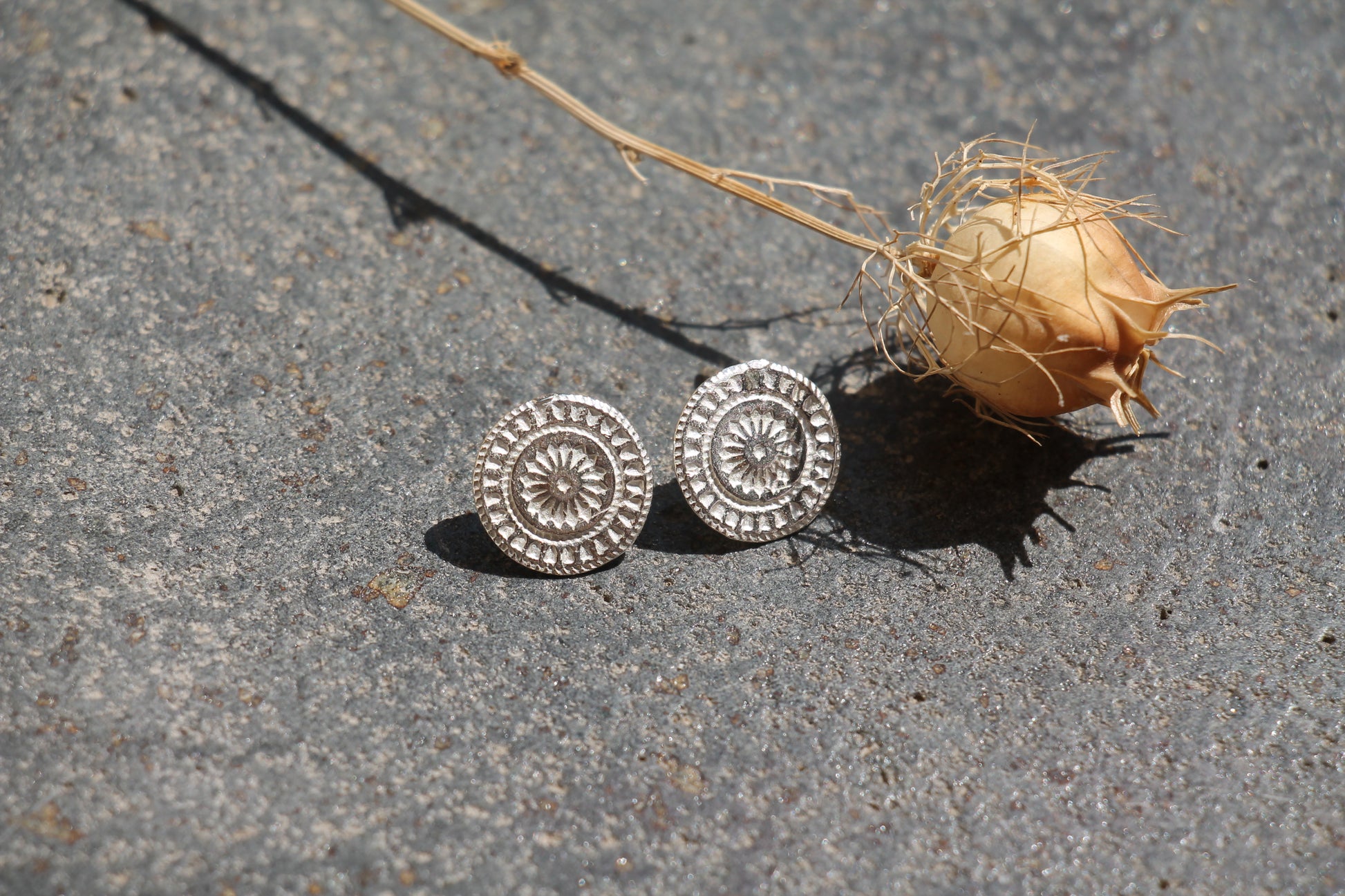 עגילים בצורת עיגול מעוטרים בצורה עדינה ומיוחדת. המנדלה היא סמל עתיק שמייצג איזון והרמוניה