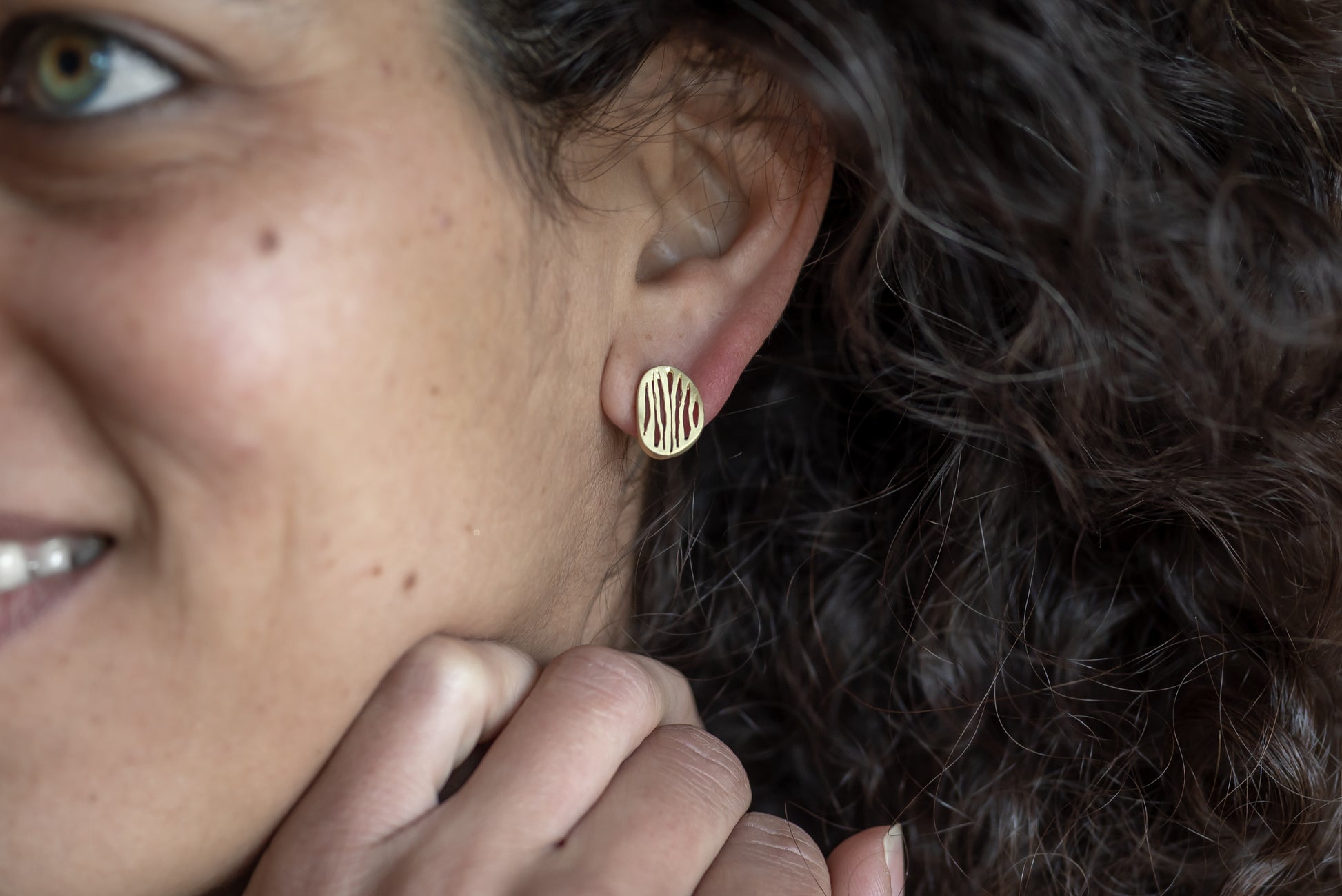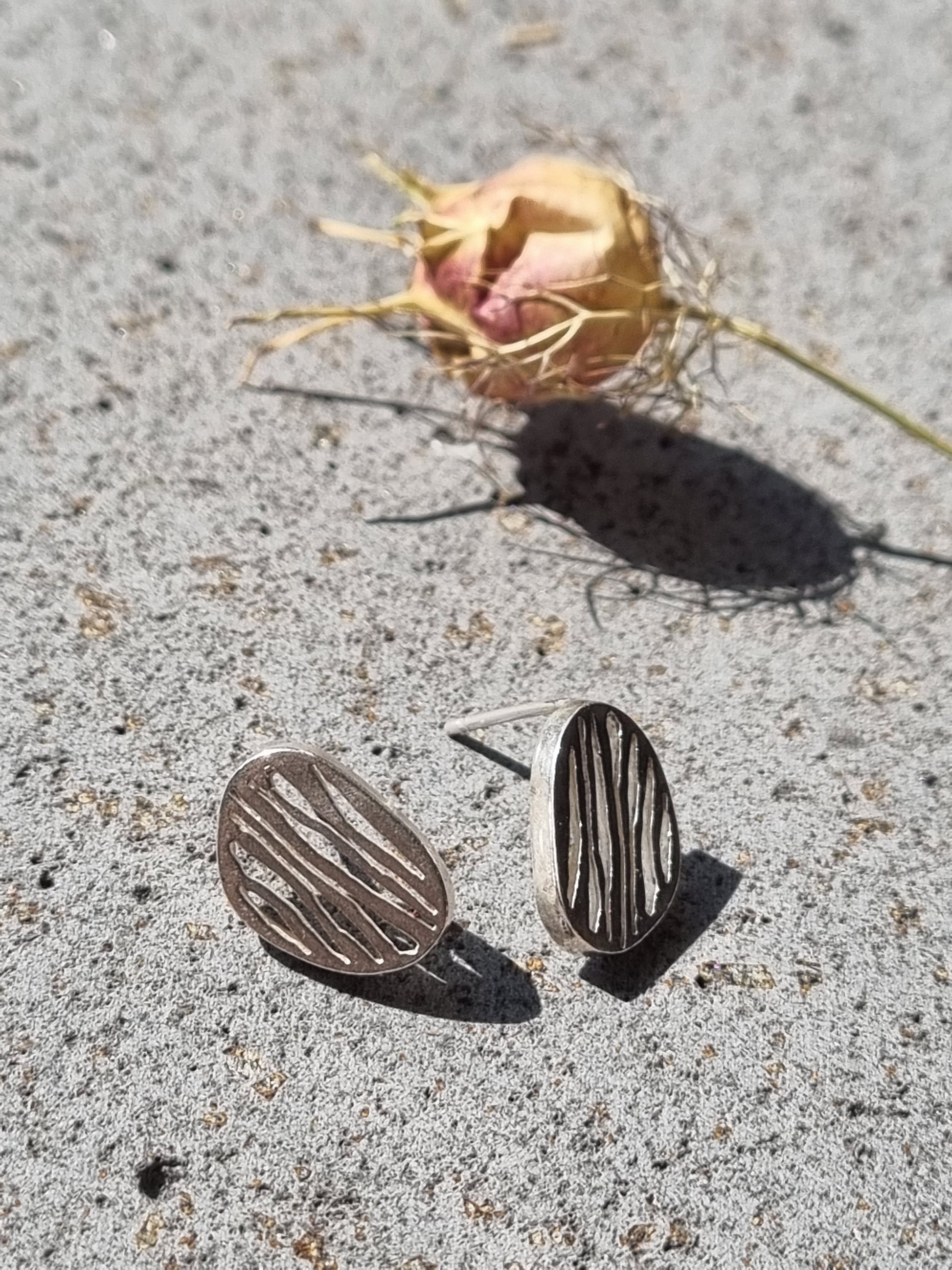 עגילים עדינים בהשראת הטבע, העגיל בצורת חלוק נחל בתוכו מנוסרים קווים דקים ועדינים בעבודת יד, שמוסיפים עומק וטקסטורה מבלי לפגוע ברכות הצורה. שילוב של טבע ופשטות עם נגיעה עיצובית ייחודית